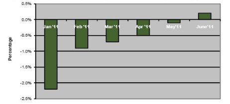下圖所示為IHS iSuppli公司對今年1到6月大尺寸液晶面板價格逐月走勢的預(yù)測。大尺寸液晶面板,是指對角尺寸為10.1至55英寸及以上的面板。