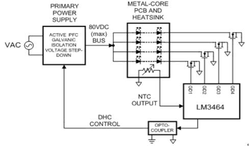 此外,本文還將給出另外一種實(shí)現(xiàn)方法的結(jié)構(gòu)示意圖,即采用隔離式AC/DC電源及一款具有動態(tài)余量控制的LM3464。通過避免電磁干擾,該方案具有極高效率。