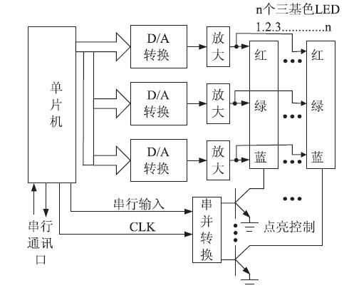 設(shè)計(jì)并制作了一套LED 調(diào)光裝置,采用單片機(jī)通過(guò)三路D \ A 轉(zhuǎn)換輸出分別控制LED 紅、綠、藍(lán)三基色輸出,實(shí)現(xiàn)對(duì)半導(dǎo)體照明色彩和亮度寬范圍、高精度的調(diào)節(jié),同時(shí)通過(guò)串并轉(zhuǎn)換掃描方式使一套系統(tǒng)可對(duì)多個(gè)LED 分別控制,實(shí)現(xiàn)其在高精度控光和控色的基礎(chǔ)上可組成任意的靜、動(dòng)態(tài)圖案或畫面。