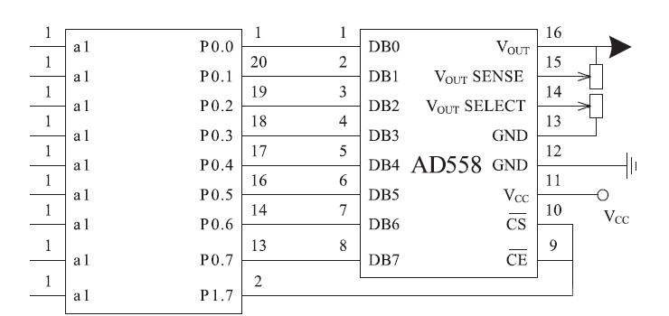 圖3 中AD558 是D /A 轉(zhuǎn)換芯片,能將數(shù)字量轉(zhuǎn)換為模擬量。單片機(jī)通過(guò)P0 口與AD558 的DB0 -DB7 連接,進(jìn)行并行數(shù)據(jù)傳輸,以此控制AD558 輸出電壓的高低,輸出電壓通過(guò)功率放大控制LED 單色發(fā)光的強(qiáng)度。由于AD558 是8 位的D /A 轉(zhuǎn)換芯片,因此通過(guò)三路D /A 分別控制三基色時(shí),其可將三基色中的紅、綠、藍(lán)分別分為28 = 256 份輸出,若將三基色任意組合即可最大形成2563 = 16777216 顏色和亮度的組合分辨率,通過(guò)軟件數(shù)據(jù)的設(shè)定可根據(jù)實(shí)際需要設(shè)置最大限度內(nèi)任意所需要的分辨率值。