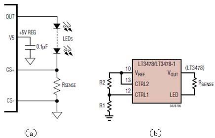 調(diào)節(jié)LED的電流最簡單的方法就是改變和LED負載串聯(lián)的電流檢測電阻(圖2a),幾乎所有DC-DC恒流芯片都有一個檢測電流的接口,是檢測到的電壓和芯片內(nèi)部的參考電壓比較,來控制電流的恒定。但是這個檢測電阻的值通常很小,只有零點幾歐,如果要在墻上裝一個零點幾歐的電位器來調(diào)節(jié)電流是不大可能的,因為引線電阻也會有零點幾歐了。所以有些芯片提供一個控制電壓接口,改變輸入的控制電壓就可以改變其輸出恒流值。例如凌特公司的LT3478(圖2b)只要改變R1和R2的比值,也可以改變其輸出的恒流值。
