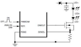 具體實現(xiàn)PWM調(diào)光的方法就是在LED的負載中串入一個MOS開關管(圖8),這串LED的陽極用一個恒流源供電。