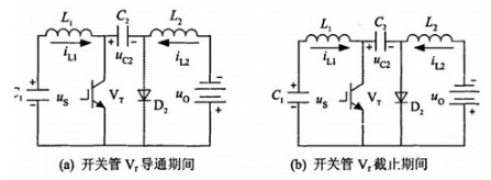 此期間開(kāi)關(guān)管Vr導(dǎo)通,電容C2上的電壓使二極管D2反偏而截止,這時(shí)輸入電流iL2使Ll儲(chǔ)能;C2的放電電流iL2使L2儲(chǔ)能,并供電給負(fù)載,如圖8(a)所示。