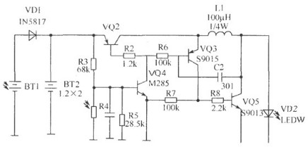 該電路的工作原理:白天有太陽(yáng)光時(shí),由BT1把光能轉(zhuǎn)換為電能,由VD1對(duì)BT2充電,由于有光照,光敏電阻呈低阻,VQ4 b極為低電平而截止。當(dāng)晚上無(wú)光照時(shí)光敏電阻呈高阻,VQ4導(dǎo)通,VQ2 b極為低電平也導(dǎo)通,由VQ3、VQ5、C2、R6、L1組成的DC升壓電路工作,LED得電發(fā)光。
