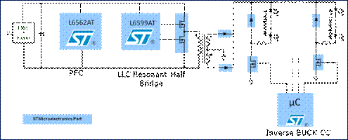 電源電路的最大輸出功率達(dá)到130W (48V,2.7A),該電路由兩級電路組成:基于L6562AT的前端功率因數(shù)校正器(PFC)和基于L6599AT的LLC諧振轉(zhuǎn)換器。