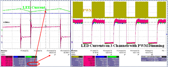 圖3:a) LED電流(綠色波形)和并聯(lián)變阻器上的電壓(紫紅色波形); b) LED燈串上的均流控制