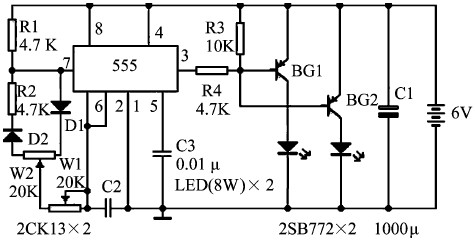 用555 時基電路可組成各種形式的自激式多諧振蕩器。大功率LED 頻閃光源,主要由1 個555 多諧振蕩器構(gòu)成的信號發(fā)生器、1 個功率放大器和2 個LED 組成。信號發(fā)生器的作用是產(chǎn)生所需要的工作頻率脈沖,并且振蕩頻率可以根據(jù)需要調(diào)整。功率放大器將脈沖信號放大后,驅(qū)動大功率LED 發(fā)光。改變信號發(fā)生器的振蕩頻率,可使光源的頻閃時間間隔隨之變化;過增、減LED 個數(shù)或更換不同功率的LED ,可以改變光源的總亮度。如圖3 所示,電路中的555 多諧振蕩器電路,既可以調(diào)節(jié)振蕩頻率,又可以調(diào)整振蕩脈沖的占空比。信號發(fā)生器的振蕩頻率就是LED 閃光的頻率,可以根據(jù)拍攝對象調(diào)整。而振蕩脈沖的占空比,決定了LED 每次頻閃的延續(xù)時間。