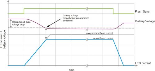 如果閃光燈驅(qū)動器本身能夠防止電池電壓下降過多,那么就可以保持較小的安全界限。通過使用一個受控轉(zhuǎn)換率升高 LED 電流,并在上升期間持續(xù)監(jiān)控電池電壓可以實(shí)現(xiàn)這一目標(biāo)。