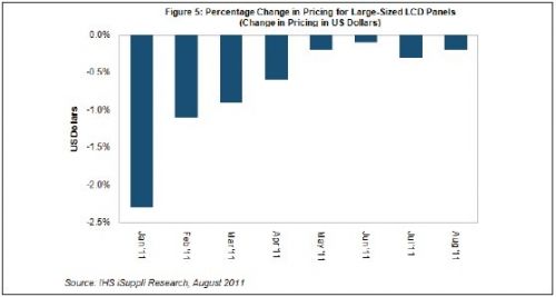 據(jù)IHS iSuppli公司的液晶顯示器(LCD)價格研究報告,8月份大尺寸LCD面板價格下降速度預(yù)計略慢于7月,供應(yīng)商積極降低產(chǎn)能利用率預(yù)計會防止面板價格進一步下滑。