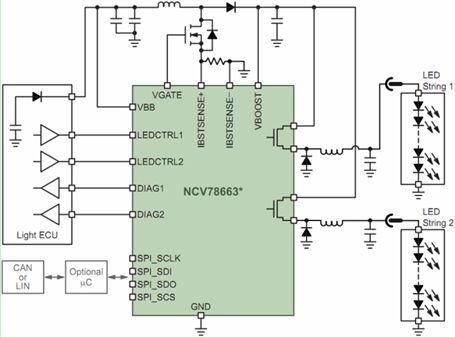 安森美半導(dǎo)體針對(duì)LED汽車前照燈系統(tǒng)開發(fā)了NCV78663電源鎮(zhèn)流器及雙LED驅(qū)動(dòng)器。NCV78663是先進(jìn)的高可靠性、高能效的系統(tǒng)級(jí)芯片(SoC) LED驅(qū)動(dòng)器,支持達(dá)2 A電流,提供高于90%的總能效,驅(qū)動(dòng)高達(dá)60 V電壓的多串LED,能以PWM調(diào)光維持色溫及控制平均電流,使設(shè)計(jì)人員能夠以一顆高集成度的SoC控制遠(yuǎn)光燈及近光燈、日間行車燈、轉(zhuǎn)向指示燈及霧燈,所需外部元件極少。這器件通過SPI接口與外部微控制器通信,在上電后動(dòng)態(tài)地控制系統(tǒng)參數(shù)、檢測(cè)LED工作狀態(tài)并反饋診斷信息。圖4顯示的是NCV78663在先進(jìn)的汽車前照燈應(yīng)用中的電路圖。