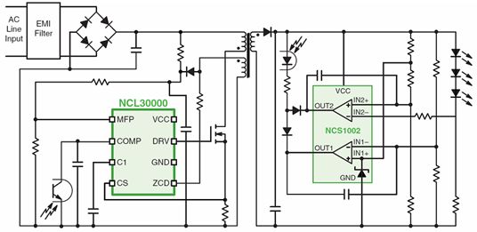 圖8:基于NCL30000的單段式CrM反激LED驅(qū)動器GreenPoint®s21參考設(shè)計簡化框圖