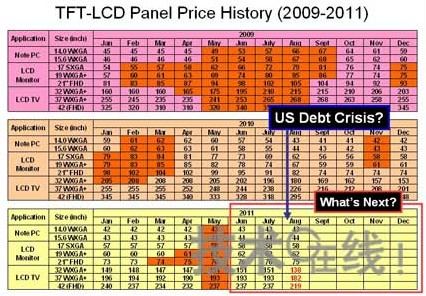 日本高級(jí)數(shù)據(jù)研究機(jī)構(gòu)首席執(zhí)行官高多清作就持這種觀點(diǎn)。2008年美國(guó)金融危機(jī)時(shí),他對(duì)TFT-LCD面板價(jià)格做出了下降走勢(shì)的準(zhǔn)確判斷,因此,他對(duì)預(yù)計(jì)本次美國(guó)債務(wù)危機(jī)期間的TFT-LCD面板價(jià)格仍會(huì)繼續(xù)走低非常自信(見(jiàn)圖1)。