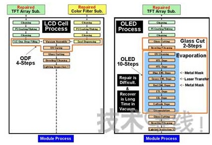 通常背光源用LED來(lái)做,因?yàn)槭屈c(diǎn)光源,所以還要加上光擴(kuò)散膜工藝。如用OLED背光源,因?yàn)槭敲婀庠?,擴(kuò)散膜工序就可省去,工藝成本下降可觀。2011年,三星、LG已開(kāi)建用OLED做背光源的TFT-LCD新生產(chǎn)線(xiàn)。