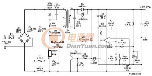 圖1所示為一個典型的20 V、14 W恒壓(CV)、恒流(CV)輸出的電源電路。LED陣列的光輸出量與所流經(jīng)的電流量成正比。因此,LED驅(qū)動器應(yīng)具有恒流輸出,而不是恒壓輸出。在本設(shè)計中,DC輸出未與AC輸入隔離,因而LED陣列和外殼應(yīng)與用戶安全地隔離開來。