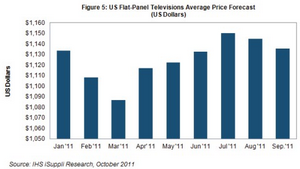 IHS公司預(yù)測,電視轉(zhuǎn)播橄欖球賽季,以及年底假日銷售季促銷活動開始,預(yù)計未來幾個月電視價格將會下降,零售商可能出清庫存,準(zhǔn)備進貨2012年新款產(chǎn)品。在經(jīng)濟不景氣之際,美國市場對價格仍然高度敏感,品牌廠商可能極其重視質(zhì)量和創(chuàng)新,以此來打敗競爭對手。