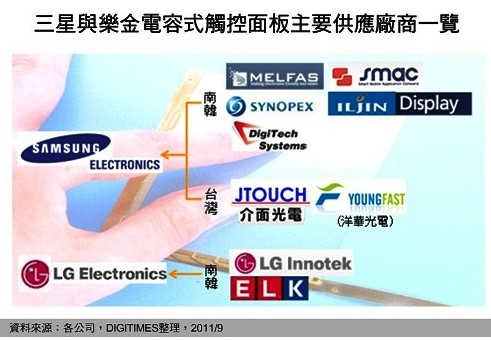 DIGITIMES Research 分析,相較于樂(lè)金主要向韓廠(chǎng)LG Innotek與ELK (Electro Luminescence Korea)采購(gòu)觸控面板,三星不僅向Melfas、SMAC (Smart Mobile Application Company)、Synopex、Iljin Display、Digitech Systems、Moreens等韓廠(chǎng)采購(gòu),亦向日廠(chǎng)、臺(tái)廠(chǎng)與大陸業(yè)者采購(gòu)觸控面板,可知三星于觸控面板采購(gòu)多角化發(fā)展較樂(lè)金顯著。