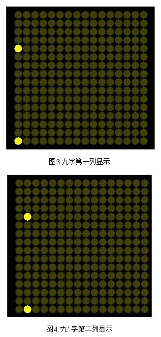 本設(shè)計(jì)的點(diǎn)陣顯示屏電路是以AT89S52 單片機(jī)作主控器,結(jié)合74LS154 和74LS595 進(jìn)行擴(kuò)展。選擇了共陰的行列掃描方式,單片機(jī)P0,P2 口輸出的高電平對(duì)應(yīng)字模的亮點(diǎn),低電平對(duì)應(yīng)字模的暗點(diǎn),以九字為例,如圖2 所示。