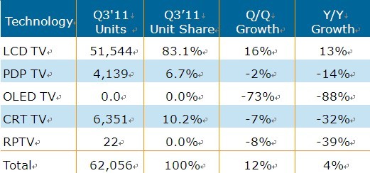 表一、Q3’11全球電視按技術(shù)別出貨量和市占率(單位:千臺)
