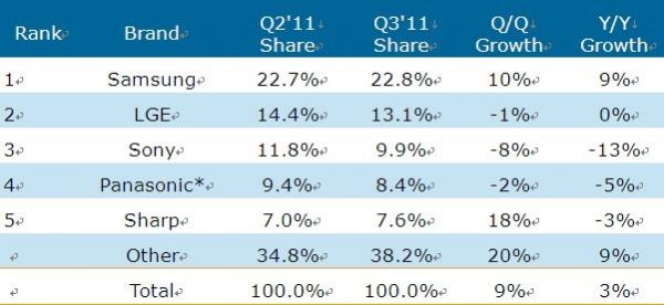 2011年第三季三星全球平板電視營收占比微幅提高,為22.8%,遠遠領(lǐng)先第二大品牌商樂金電子。就營收而言,除了在日本沒有出售電視,三星在全球其他各個地區(qū)營收第一,在亞太地區(qū)和拉美地區(qū)領(lǐng)先于樂金電子。三星液晶電視和等離子電視營收居于首位,CRT電視居第二位,并是五大品牌商中唯一一家營收同比成長的品牌商。