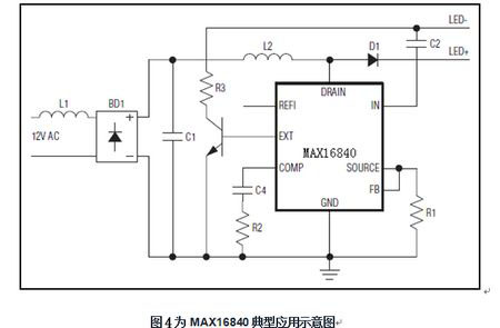 MAX16840具有的應用特征是LED換代燈構(gòu)建技術(shù)的保證。MAX16840 集成MOSFET LED驅(qū)動器,可用于MR16及其它12V交流輸入燈。它采用獨特的技術(shù)控制燈管的輸入電流,對輸入電流進行整形,可使用大多數(shù)電子變壓器和調(diào)光器支持無閃爍工作,很好地解決了上述“問題的提出”之困擾。