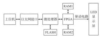 系統(tǒng)采用新一代的32bitRISC處理器STM32作為主控芯片,通過(guò)以太網(wǎng)傳輸數(shù)據(jù),以FLASH作為存儲(chǔ)模塊,由FPGA完成對(duì)LED顯示屏的高速掃描刷新。系統(tǒng)工作時(shí),利用上位機(jī)編輯顯示信息,通過(guò)以太網(wǎng)接口將顯示信息傳輸給微處理器,微處理器接收數(shù)據(jù)信息后寫入FLASH存儲(chǔ)器。在顯示時(shí),微處理器讀取FLASH中的數(shù)據(jù),通過(guò)總線將數(shù)據(jù)以并行方式發(fā)送給FPGA,FPGA處理后將數(shù)據(jù)傳輸?shù)絃ED顯示屏顯示。