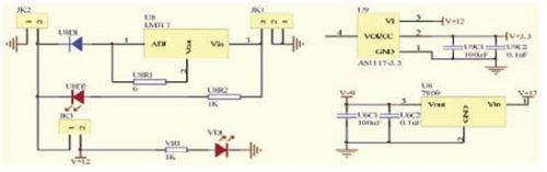 電源采用12V/1000mAh的鋰電池,直接為傾角傳感器供電,再經兩路DC-DC轉換,分別轉換至9V和3.3V,9V電源為無線數傳模塊供電,3.3V為主控制器及接口電路供電,充電電路采用LM317芯片,恒流方式充電。電源電路見圖4所示。