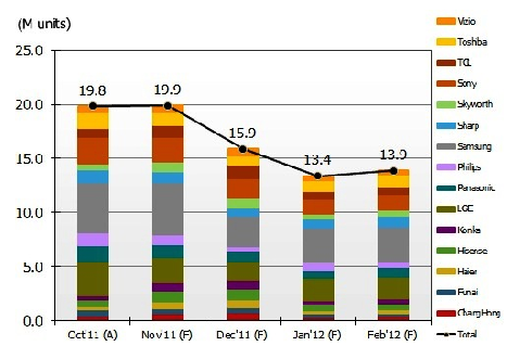 NPD DisplaySearch認(rèn)為,盡管北美和中國(guó)大陸的銷售實(shí)績(jī)強(qiáng)勁,液晶電視品牌商仍謹(jǐn)慎管控庫(kù)存。從12月到 2012年2月,液晶電視品牌計(jì)劃降低生產(chǎn)數(shù)量以預(yù)防在傳統(tǒng)的第一季淡季堆積過(guò)多的庫(kù)存。在全球液晶電視品牌生產(chǎn)計(jì)劃調(diào)查中顯示, 2012年1月的整機(jī)生產(chǎn)量將降到1,340萬(wàn)臺(tái)的數(shù)量,而液晶電視面板業(yè)者則將需在未來(lái)的幾個(gè)月持續(xù)控制產(chǎn)能利用率,即使面板價(jià)格轉(zhuǎn)為穩(wěn)定。