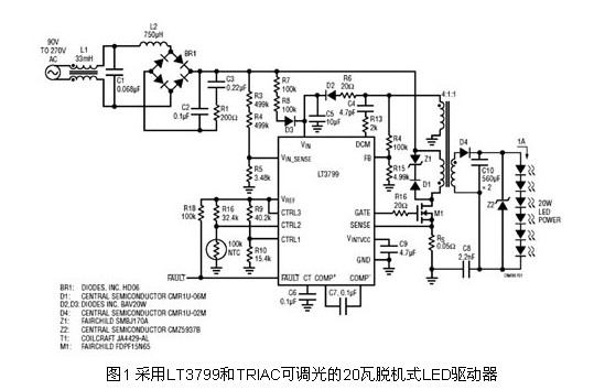 為了滿足脫機(jī)式照明的要求,例如高功率因子、高效率、隔離和TRIAC調(diào)光器兼容性,先前的LED驅(qū)動(dòng)器采用很多外部分立式組件,結(jié)果形成了既龐大又復(fù)雜的解決方案。而最新的驅(qū)動(dòng)器LT3799則整合了脫機(jī)式LED照明需要的所有功能,解決了相關(guān)復(fù)雜性、空間和效能問(wèn)題。LT3799是一款具主動(dòng)功率因子校正的隔離反馳式LED控制器,專門為在90~265VAC的通用輸入范圍驅(qū)動(dòng)LED而設(shè)計(jì)。該組件以關(guān)鍵導(dǎo)通(邊界)模式控制一個(gè)隔離反馳式轉(zhuǎn)換器,適用于需要4~100瓦或更高LED功率的LED應(yīng)用。其新穎的電流檢測(cè)電路無(wú)須使用光耦合器,就能向二次側(cè)提供良好調(diào)節(jié)的輸出電流。其獨(dú)特的泄能(Bleeder)電路使得LED驅(qū)動(dòng)器可與TRIAC調(diào)光器兼容,而無(wú)須增設(shè)額外的組件。LED開路和短路保護(hù)則可確保長(zhǎng)期可靠性。