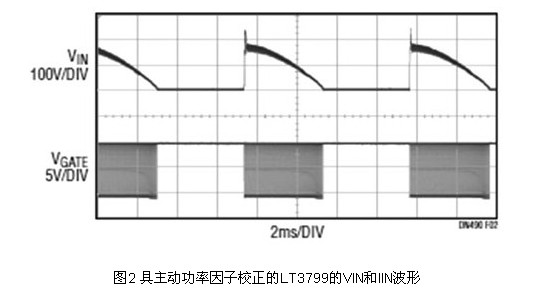 透過(guò)使線路電流跟隨施加的正弦波電壓,這種高功能整合的驅(qū)動(dòng)電路實(shí)現(xiàn)了高功率因子,并且滿足了IEC 61000-3-2 C類照明設(shè)備諧波要求。如果所吸取的電流與輸入電壓成正比,就能實(shí)現(xiàn)等于1的功率因子。其用一個(gè)從輸入電壓產(chǎn)生并與輸入電壓成比例的電壓調(diào)制峰值開關(guān)電流。如圖2所示,這種方法提供0.98或更高的功率因子。一個(gè)小帶寬回饋環(huán)路保持對(duì)輸出電流的調(diào)節(jié),而且不會(huì)使輸入電流失真。