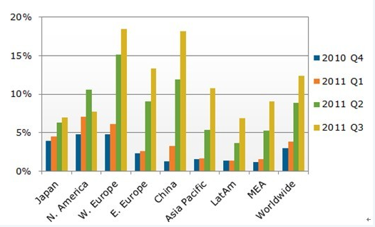 圖一、Q4’10-Q3’11全球分區(qū)域3D電視滲透率