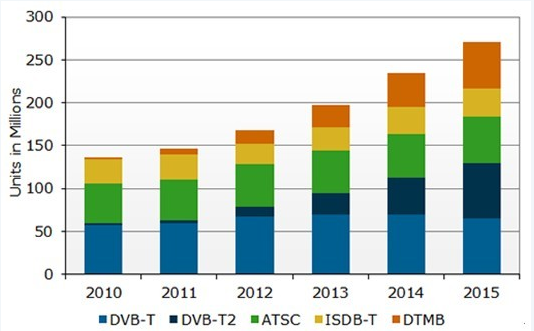 “到2015年,DVB-T和DVB-T2電視的出貨量將處于相當水平,”Gray繼續(xù)說到,“俄羅斯和印度政府轉向T2的決定給行業(yè)注入強心劑,并將推動成本下降,促進新一輪電視應用。”