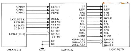 LZ9FC22和OMAP5910的LCD控制器連接,由于LZ9FC22是18位控制器(RGB信號(hào)各有6位),而OMAP5910的LCD控制器的輸出只有16位數(shù)據(jù),為此必須損失兩位數(shù)據(jù),將LZ9FC22的R0和BO接地,或者將R0和R5、BO和B5連接在一起。