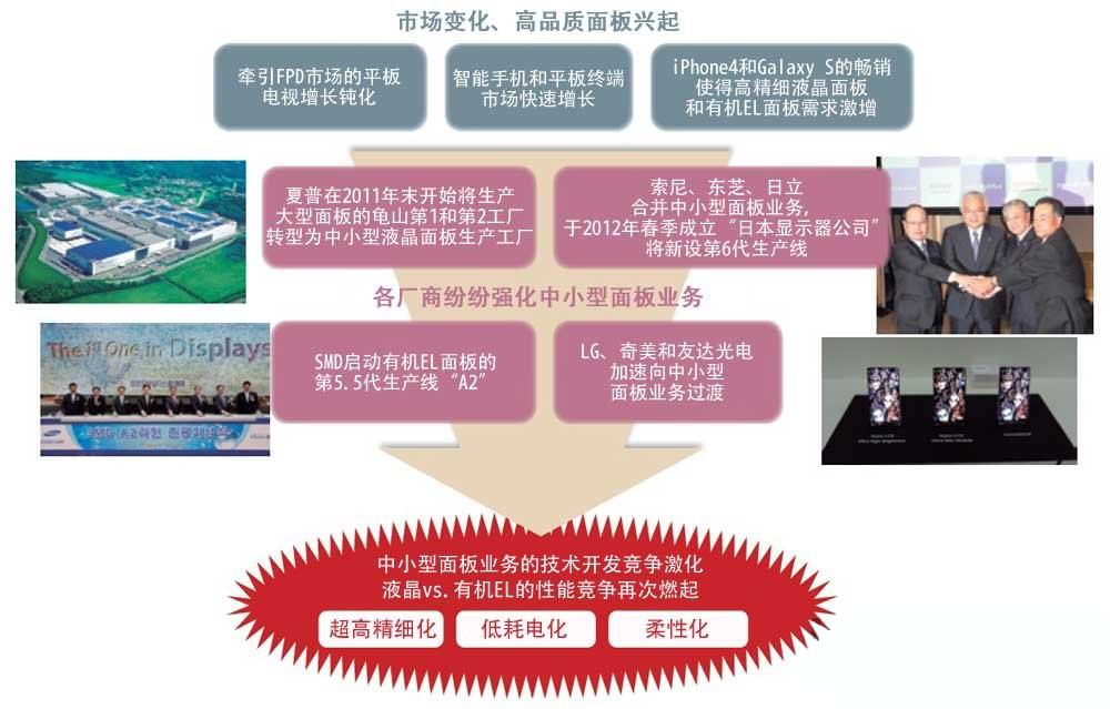 日韓臺(tái)的面板廠(chǎng)商開(kāi)始將業(yè)務(wù)重心從電視機(jī)用大型面板轉(zhuǎn)向智能手機(jī)和平板終端使用的中小型面板。今后,技術(shù)開(kāi)發(fā)競(jìng)爭(zhēng)將越來(lái)越激烈。