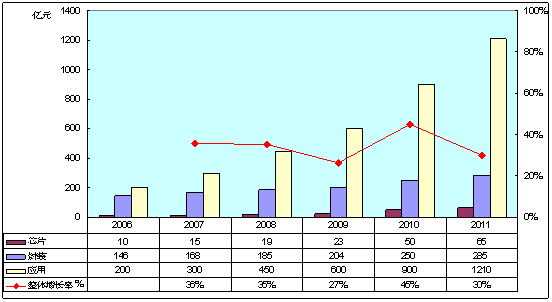 2011年,我國半導體照明產(chǎn)業(yè)規(guī)模達到1560億元,較2010年的1200億元增長30%。其中上游外延芯片、中游封裝、下游應用的規(guī)模分別為65億元、285億元和1210億元,增速略有放緩。