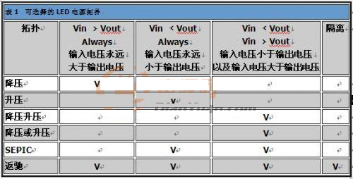 表1的信息可供作選擇LED驅(qū)動器最佳切換拓?fù)涞膮⒖?。除了這些拓?fù)渲?,也可以使用簡單的電流限制電阻或是線性穩(wěn)壓器,不過這些方法通常會耗用過多功率。輸入電壓范圍、驅(qū)動的LED數(shù)目、LED電流、隔離、電磁干擾(EMI)限制以及效能,都是相關(guān)的設(shè)計參數(shù)。大部分的LED驅(qū)動電路可分為以下幾種拓?fù)漕悇e:降壓、升壓、降壓升壓、SEPIC以及返馳。