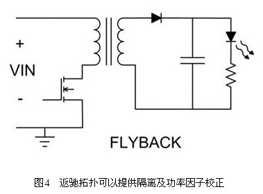 基于安全考慮,可能會規(guī)定在脫機(jī)電壓及輸出電壓之間進(jìn)行隔離。此應(yīng)用方式下,最節(jié)省成本的解決方法就是使用返馳轉(zhuǎn)換器(圖4),在所有的隔離拓?fù)渲?,這種作法所需要的組件數(shù)量最少。變壓器匝數(shù)比可用來對輸出電壓進(jìn)行降壓、升壓或降壓升壓,設(shè)計彈性很大,不過缺點在于電源變壓器基本上是訂制組件。此外,在FET以及輸入和輸出電容器中,也會有高組件應(yīng)力的情形出現(xiàn)。應(yīng)用固定燈光時,可以使用「慢速」的回饋控制循環(huán),調(diào)節(jié)LED電流與輸入電壓同相位的情形,進(jìn)行功率因子校正(PFC)。這樣可以調(diào)節(jié)所需的平均LED電流,并能調(diào)節(jié)輸入電流與輸入電壓同相位的情形,以提供高功率因子。