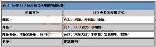 如同表2所示,LED已廣泛運用于各領(lǐng)域,因此需要許多種類的電源拓?fù)洌С諰ED的應(yīng)用。一般而言,必須考慮輸入電壓、輸出電壓及對隔離的需求,以做出適當(dāng)選擇。
