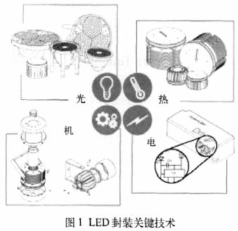 LED 的封裝技術(shù)實(shí)際上是借鑒了傳統(tǒng)的微電子封裝技術(shù),但LED 有其獨(dú)特之處,又不能完全按照微電子封裝去做。整個(gè)LED 封裝工藝主要包括封裝原料的選取、封裝結(jié)構(gòu)的設(shè)計(jì)、封裝工藝的控制以及光學(xué)設(shè)計(jì)與散熱設(shè)計(jì),概括來講就是熱- 電- 機(jī)-光(T.E.M.O.),如圖1 所示,這是LED封裝的關(guān)鍵技術(shù)。