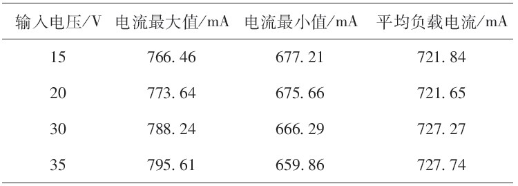 表2為不同輸入電壓下負(fù)載電流的峰-峰值。由表中數(shù)據(jù)計算,在輸入電壓由15V變化至35V的過程中,負(fù)載電流的最大誤差僅為0.81%.