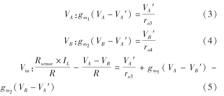 的微小值。由式(6)可以看出,當(dāng)gm1ro2或gm2越大,VA與VB的匹配度越高,電流采樣越精確。值得注意的是,式中出現(xiàn)gm1ro3的平方項,這意味著可以用較小的增益達(dá)到高精度。但是,耐壓5 V的低壓管無法在高輸入電壓下正常工作,電路中必須使用大量耐壓40 V的高壓管。然而高壓管的增益與等效輸出電阻很低,無法滿足電流采樣電路的精度要求。