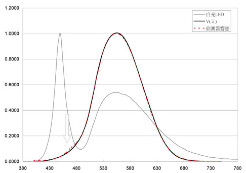 圖5 白光LED多以藍(lán)光激發(fā)黃色熒光粉,在藍(lán)光波段(圖中箭號(hào)表示)處,亮度計(jì)探頭的視效函數(shù)(虛線表示)響應(yīng)與CIE V(λ)匹配不佳時(shí),差異的比例就會(huì)加大。