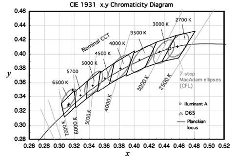 此規(guī)范包含美國國家標(biāo)準(zhǔn)中針對(duì)固態(tài)照明產(chǎn)品的光色特性規(guī)格定義,適用于室內(nèi)使用的燈具,不包括戶外燈具。其中,重點(diǎn)有兩部分,其一是定義相對(duì)色溫(CCT)的分級(jí),其次是針對(duì)同一相對(duì)色溫標(biāo)稱等級(jí)其允許的色溫變異范圍作定義。