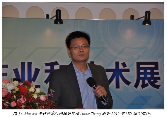 有業(yè)內(nèi)人士說(shuō),2011年LED庫(kù)存過(guò)大,會(huì)使2012年的市場(chǎng)不如2011年。對(duì)此觀點(diǎn),Marvell公司全球技術(shù)行銷(xiāo)高級(jí)經(jīng)理Lance Zheng有不同看法,“國(guó)內(nèi)裝機(jī)量非常多,這個(gè)是造成產(chǎn)能過(guò)剩的原因,但提高光效會(huì)是刺激LED行業(yè)發(fā)展的非常好的方式,因?yàn)楣庑б惶岣咚玫腖ED數(shù)量就會(huì)小,因此能降低成本,促進(jìn)LED市場(chǎng)發(fā)展。至于說(shuō)2012年整個(gè)產(chǎn)業(yè)應(yīng)該還是保持增長(zhǎng),這里的亮點(diǎn)就是LED照明。”他在“2012產(chǎn)業(yè)和技術(shù)展望媒體研討會(huì)”上這樣表示。