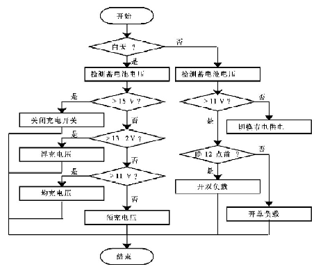 在放電過(guò)程中,首先保證在晚上12點(diǎn)前開(kāi)通兩路負(fù)載,12點(diǎn)后開(kāi)通一路負(fù)載,并且當(dāng)蓄電池電壓低于保護(hù)電壓(11V)時(shí),控制器自動(dòng)切換到市電供電系統(tǒng)或關(guān)閉負(fù)載開(kāi)關(guān)以保護(hù)蓄電池不受損壞。因此,充電管理和放電管理是系統(tǒng)軟件設(shè)計(jì)中的主要內(nèi)容,充放電程序流程圖如圖4 所示: