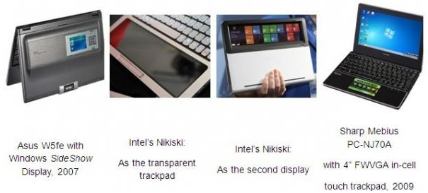 除了將觸控導(dǎo)入于筆記本電腦屏幕外,從過去到現(xiàn)在也一直有新的創(chuàng)意想法在開發(fā)、進(jìn)行中。過去當(dāng)Windows Vista問世時(shí),SideShow的功能讓筆記本電腦多了一個(gè)小屏幕(如Asus W5fe)。雖然當(dāng)時(shí)并不是觸控屏幕而是采實(shí)體按鍵,但對(duì)于一些簡(jiǎn)單的操作目的(像是信件、日程、音樂播放等),用戶就不需要打開筆記本電腦、而直接于這個(gè)小屏幕操作。后來(lái)的創(chuàng)意還有像是:SHARP將In-Cell內(nèi)嵌式觸控面板導(dǎo)入筆記本電腦的觸摸板,以及Intel于2012年CES展中所揭示的Nikiski概念。Nikiski在正常鍵盤輸入時(shí)可充當(dāng)觸摸板,合起來(lái)時(shí)又如同SideShow的附加屏幕,不過卻可以觸控支持Metro接口的使用。受限于當(dāng)時(shí)時(shí)空環(huán)境里消費(fèi)者使用情境、相關(guān)技術(shù)、成本等因素的成熟度與配合,這些創(chuàng)意或其衍伸當(dāng)時(shí)并未真正導(dǎo)入市場(chǎng),不過這并不代表這些創(chuàng)意未來(lái)就沒有面市的可能性。