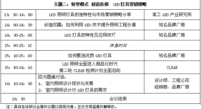 整個(gè)巡回研討會(huì)暨大賽將持續(xù)5個(gè)月時(shí)間,3月份為活動(dòng)啟動(dòng)宣傳階段,4-5月份為全國(guó)巡回研討及大賽報(bào)名階段,6‐8 月份為大賽作品提交及評(píng)審階段。巡回總結(jié)大會(huì)暨設(shè)計(jì)大賽頒獎(jiǎng)典禮將于2012 高工LED 展期間(8 月17 日)在廣州保利世貿(mào)館召開(kāi)。