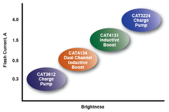 LED越來(lái)越多地應(yīng)用于拍照手機(jī)、智能手機(jī)和氙氣燈泡替代,且光輸出能力不斷提供,從而滿足更高的性能需求。安森美半導(dǎo)體的CAT3612、CAT4131、CAT4134和CAT3224都是這類驅(qū)動(dòng)方案。這些器件分別采用電荷泵、電感升壓拓?fù)浣Y(jié)構(gòu),可以提供不同的閃光電流和亮度。