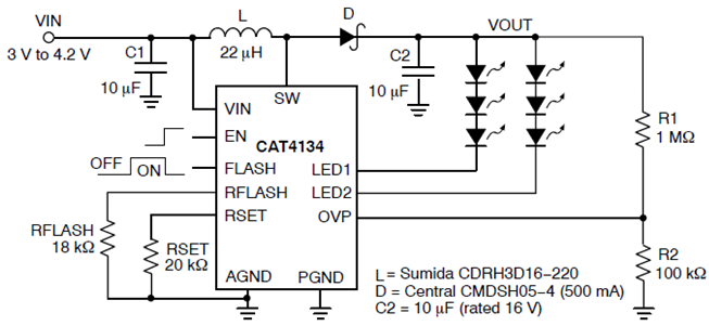 以CAT4134為例,這是一款大功率電感升壓型雙通道驅(qū)動(dòng)轉(zhuǎn)換器,提供2路匹配的LED電流。輸出電流級(jí)別通過(guò)2個(gè)電阻之一RSET或RFLASH來(lái)控制。當(dāng)FLASH輸入引腳為低(電影模式),電阻RFLASH設(shè)置LED電流。每個(gè)通道驅(qū)動(dòng)2或3個(gè)白色串聯(lián)LED,并提供1個(gè)可調(diào)節(jié)電流以控制其亮度。支持輸入電壓低至3V,使得器件適合于鋰離子電池的應(yīng)用。