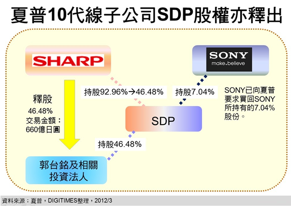 除此之外,黃銘章說明,夏普以10代TFT LCD產(chǎn)線(2,880mm×3,130mm)為主體的子公司Sharp Display Products (SDP),其46.48%股權(quán)也將出售給鴻海創(chuàng)辦人及董事長郭臺(tái)銘及相關(guān)投資人,屆時(shí)夏普及鴻海相關(guān)投資人將各持有SDP 46.48%股權(quán),剩余7.04%股權(quán)原由Sony持有,但3月28日Sony已要求夏普買回此一部分股份。