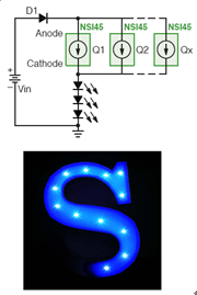 NSI45的另一個(gè)典型應(yīng)用是用作顯示屏和廣告牌文字電路的恒流穩(wěn)流器線性LED驅(qū)動(dòng)器。其特點(diǎn)包括低啟動(dòng)電壓,無(wú)論正向電壓(Vf)如何變化都可以實(shí)現(xiàn)精密穩(wěn)流,具有負(fù)溫度系數(shù)特性,可以保護(hù)LED。
